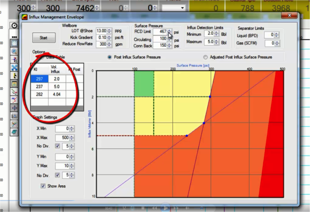 - La tabla de resultados muestra los resultados de la intensidad del influjo, la presión de cierre de la tubería de perforación (SIDP), la presión máxima de la tubería de perforación (SBP), la ECD del revestimiento y la presión del revestimiento